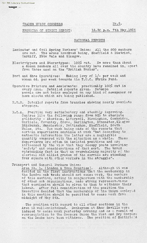 TUC Progress of Strike Report No. 2, 7 May 1926 (page 1)