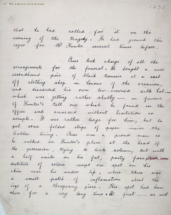 that he had called for it on the evening of the tragedy. He had ground this razor for Mr Hunter several times before. Crass took charge of all the arrangements for the funeral. He bought a new second-hand pair of black trousers at a cast-off clothing shop in honour of the occasion, and discarded his own low-crowned silk hat - which was getting rather shabby - in favour of Hunter's tall one, which he found in the office and annexed without hesitation or scruple. It was rather large for him, but he put some folded strips of paper inside the leather lining. Crass was a proud man as he walked in Hunter's place at the head of the procession, trying to look solemn, but with a half-smile on his fat, pasty face, destitute of colour except one spot on his chin near his underlip, where there was a small patch of inflammation about the size of a threepenny piece. This spot had been there for a very long time. At first - as well |