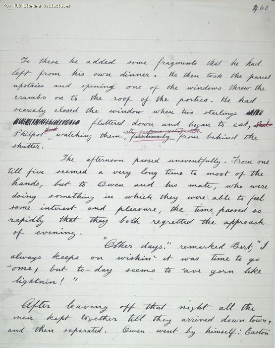 To these he added some fragments that he had left from his own dinner. He then took the parcel upstairs and opening one of the windows threw the crumbs on to the roof of the portico. He had scarcely closed the window when two starlings fluttered down and began to eat. Philpot watching them furtively from behind the shutter. The afternoon passed uneventfully. From one till five seemed a very long time to most of the hands, but to Owen and his mate, who was doing something in which they were able to feel some interest and pleasure, the time passed so rapidly that they both regretted the approach of evening. `Other days,' remarked Bert, `I always keeps on wishin' it was time to go 'ome, but today seems to 'ave gorn like lightnin'!' After leaving off that night, all the men kept together till they arrived down town, and then separated. Owen went by himself: Easton, |