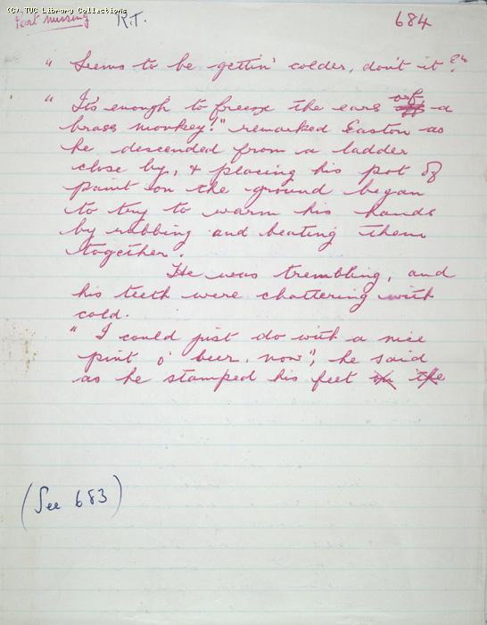 `Seems to be gettin' colder, don't it?' `It's enough to freeze the ears orf a brass monkey!' remarked Easton as he descended from a ladder close by and, placing his pot of paint on the pound, began to try to warm his hands by rubbing and beating them together. He was trembling, and his teeth were chattering with cold. `I could just do with a nice pint of beer, now,' he said as he stamped his feet on the pound. |
