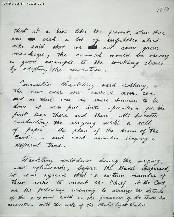 that at a time like the present, when there was sich a lot of infiddles about who said that we all came from monkeys, the Council would be showing a good example to the working classes by adopting the resolution. Councillor Weakling said nothing, so the new rule was carried nem. con., and as there was no more business to be done it was put into operation for the first time there and then. Mr Sweater conducting the singing with a roll of paper - the plan of the drain of `The Cave' - and each member singing a different tune. Weakling withdrew during the singing, and afterwards, before the Band dispersed, it was agreed that a certain number of them were to meet the Chief at the Cave, on the following evening to arrange the details of the proposed raid on the finances of the town in connection with the sale of the Electric Light Works. |