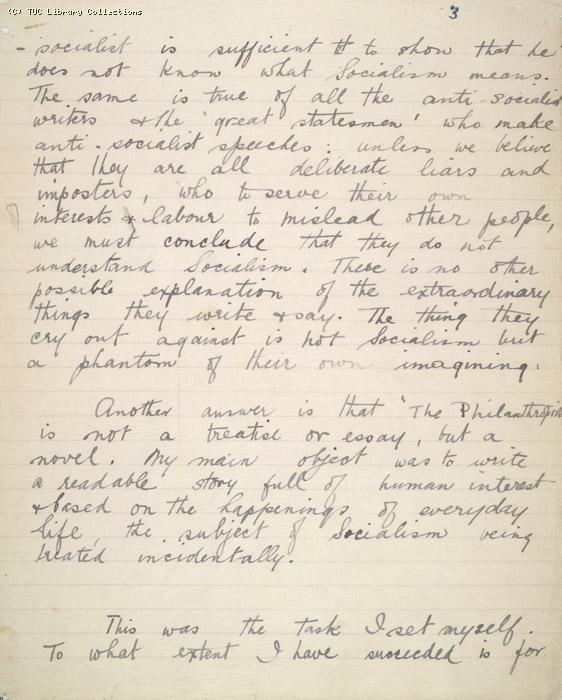 -socialist is sufficient to show that he does not know what Socialism means. The same is true of all the anti-socialist writers and the `great statesmen' who make anti-socialist speeches: unless we believe that they are deliberate liars and imposters, who to serve their own interests and labour to mislead other people, we must conclude that they do not understand Socialism. There is no other possible explanation of the extraordinary things they write and say. The thing they cry out against is not Socialism but a phantom of their own imagining. Another answer is that `The Philanthropists' is not a treatise or essay, but a novel. My main object was to write a readable story full of human interest and based on the happenings of everyday life, the subject of Socialism being treated incidentally. This was the task I set myself. To what extent I have succeeded is for |