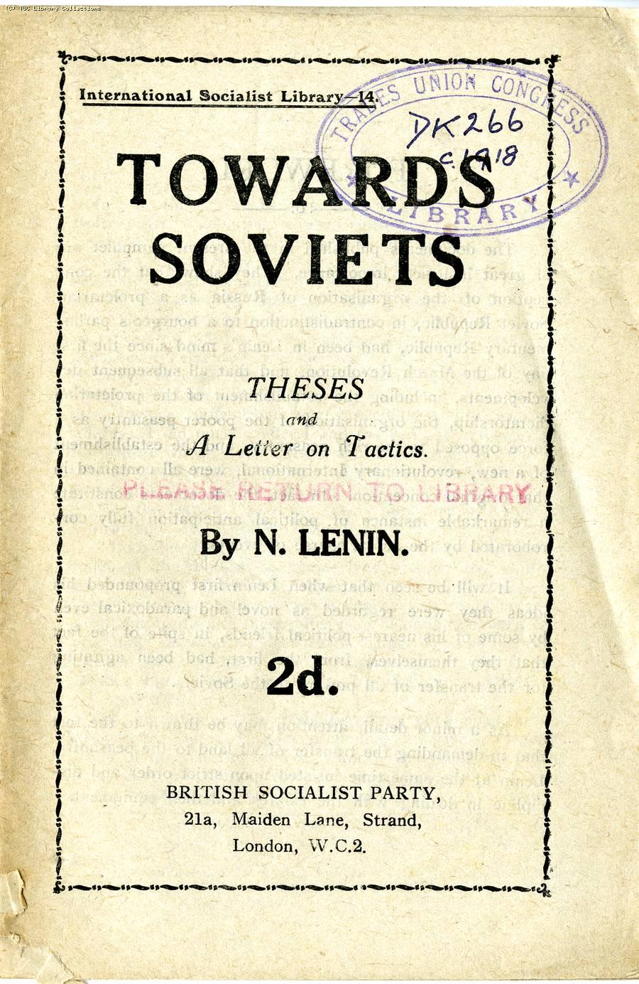 ‘Towards Soviets: theses and a letter on tactics’ was a pamphlet written by Vladimir Ilyich Ulyanov, under his pseudonym Nikolai Lenin, and published by the British Socialist Party about 1918. The British Socialist Party was established in 1911 and merged with other radical groups to form the Communist Party in 1920.