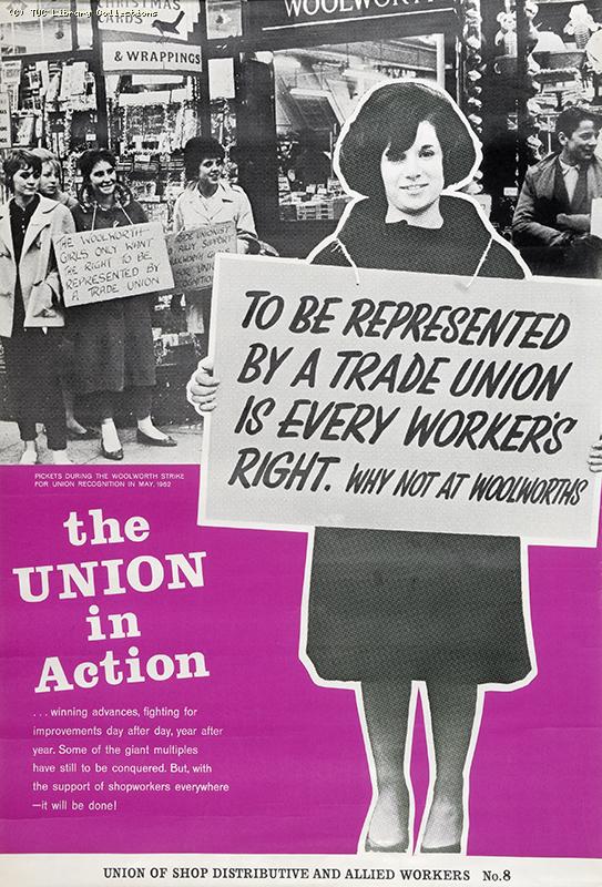 This poster was produced by the Union of Shop, Distributive and Allied Workers in support of the strike for union recognition and representation at Woolworth. The poster shows women on a picket line outside the store.